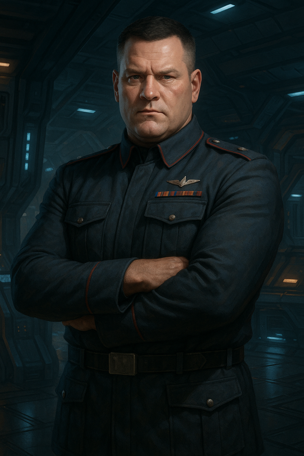 Falk est un homme d’une quarantaine d’années, à la carrure solide sans excès, le visage marqué par des années de service. Ses traits durs sont adoucis par un regard clair et franc, souvent traversé d’une ironie bienveillante. Ses cheveux sont courts, poivre et sel, taillés selon la rigueur militaire, mais son uniforme n’est jamais impeccable : il le porte avec la nonchalance des vétérans qui ont cessé de jouer aux soldats. Quand il marche, tout en lui respire le calme pragmatique : un homme qui a connu le feu, la perte, et qui ne s’émeut plus de grand-chose — sauf de ses pilotes.